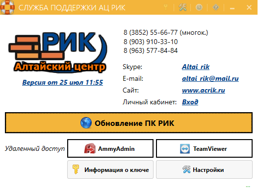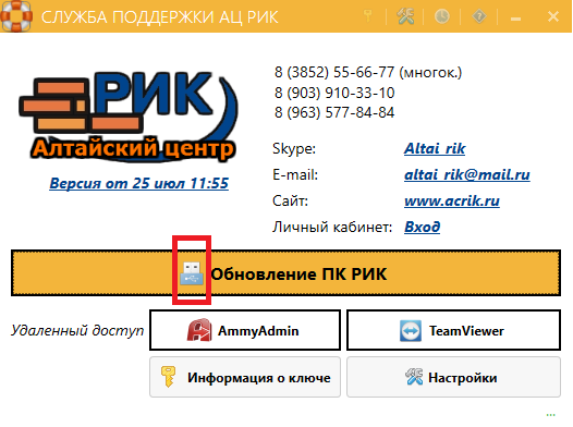 6. Запустите программу «Служба поддержки АЦ РИК». На кнопке «Обновление ПК РИК» должна быть иконка флешки:
